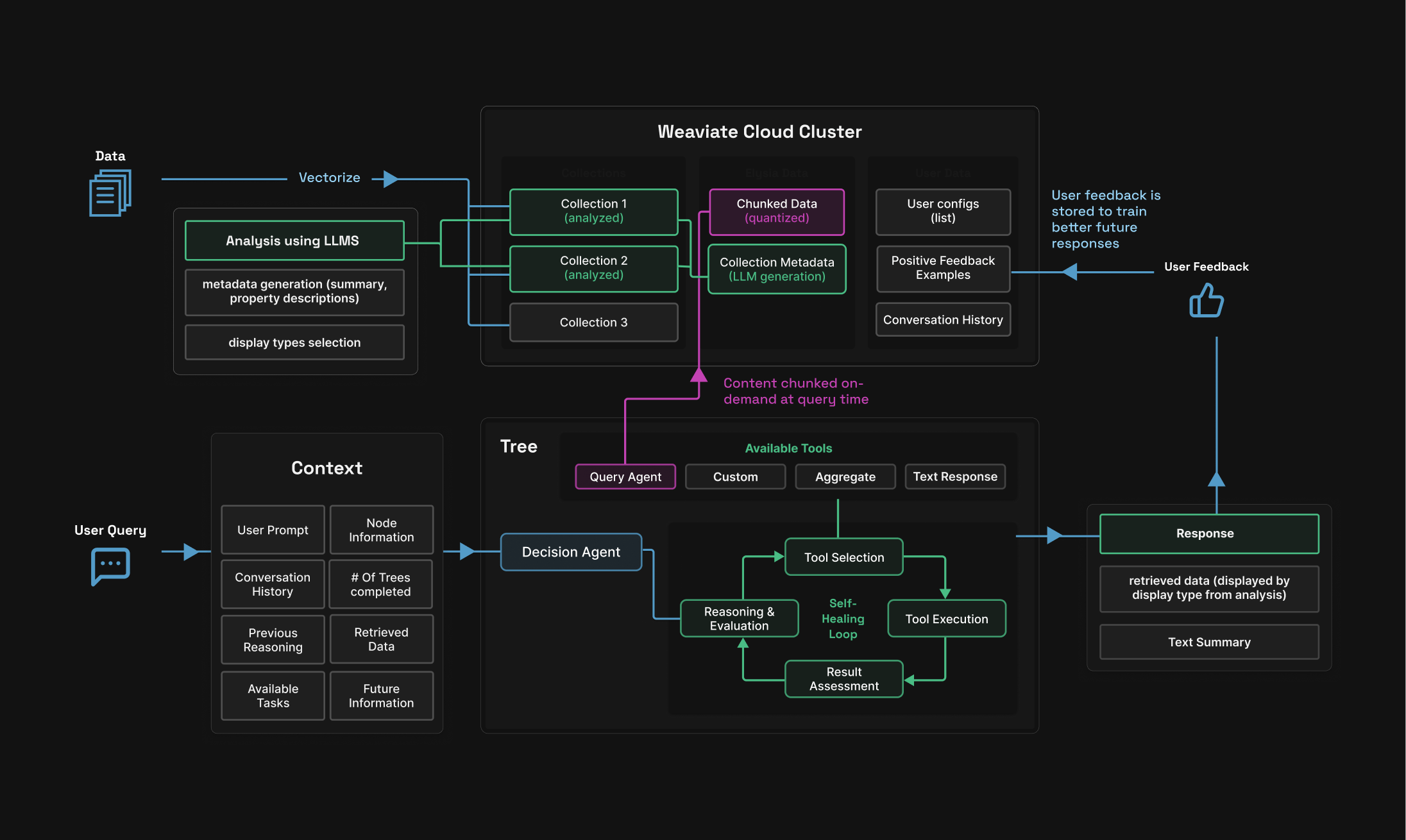 Elysia is a decision tree based agentic system which intelligently decides what tools to use, what results have been obtained, whether it should continue the process or whether its goal has been completed. It offers both a full frontend interface and an easily pip-installable Python package.